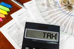 young woman work with tax form 2022. Deduction planning concept. April time for tax, deadline